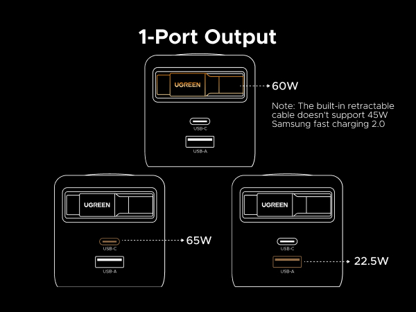 - 【Kindly Note】Product size: 8.8*5.3*4.7cm. The built-in retractable cable does not support SuperCharge 2.0 65W, but the other USB-C port support 65W fast charging, which requires a 5A cable.