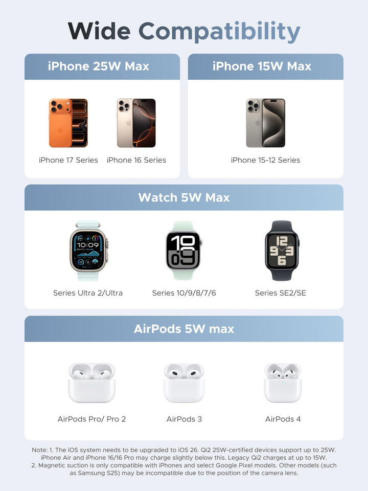 Supported Protocols / Output | Phone Output: Qi2 25W, Earbuds Output: Qi 2 (BPP) |