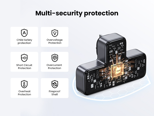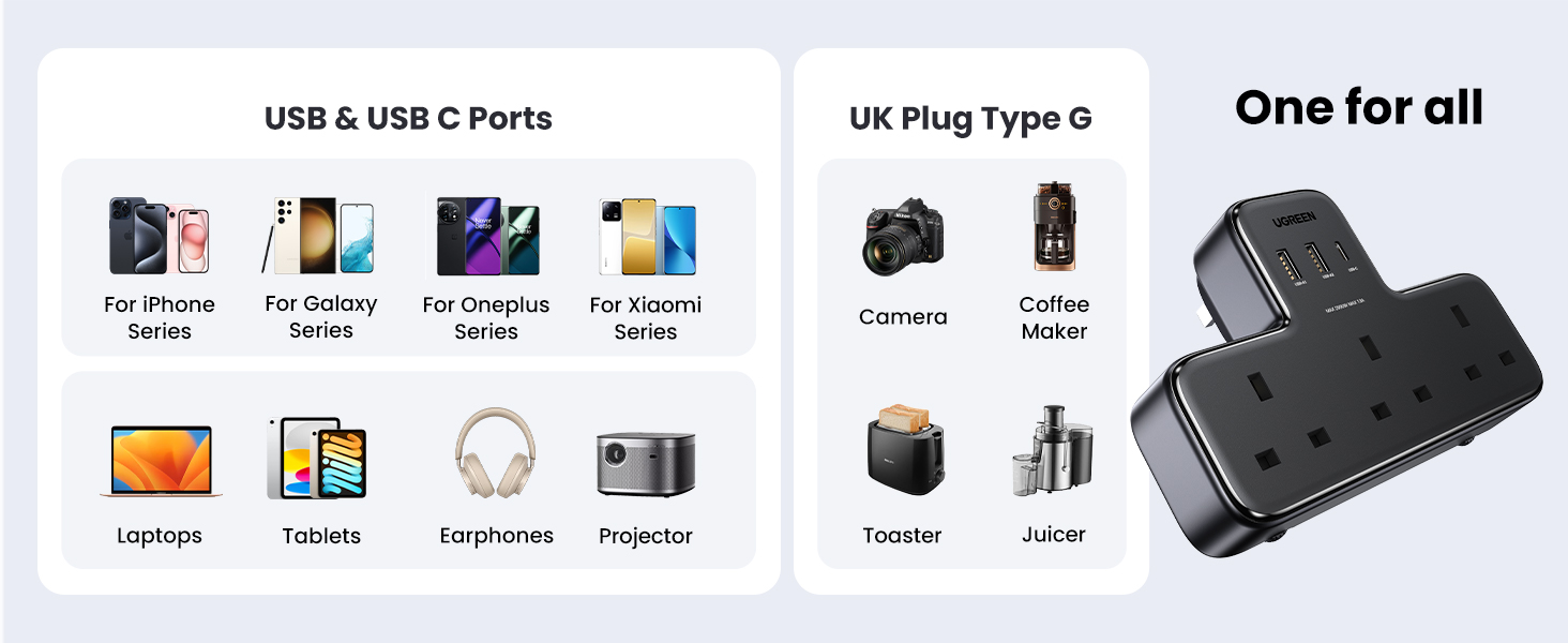 - 【6-in-1 Charger Plug, Perfect Power Extension】Features 3 Type G socket AC outlet (2990W) and 3 USB ports(PD 30W USB-C port & 2 USB-A ports), UGREEN triple multiple socket adapter can connect 6 devices simultaneously, ideal for daily needs, without worry about messy extension cord.