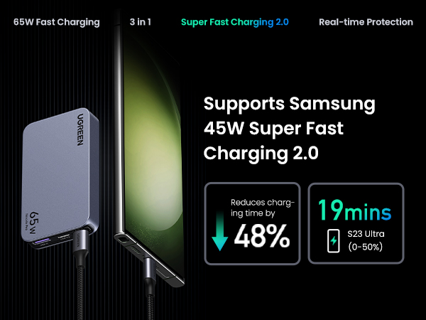 - 【Energy Saving, Environmental Friendly】: UGREEN Nexode Pro 65W USB C charger enjoys the innovative Hybrid Power Solution, which increases the power conversion rate to 95%, and provides industry-leading efficiency to avoid wasting energy and be more environmental.