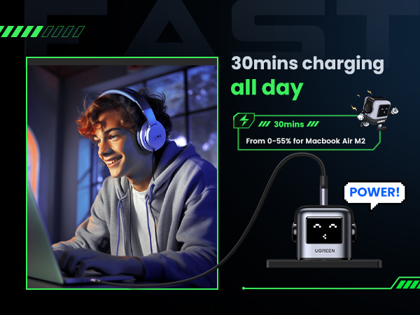 - 【65W Chargring, More Powerful and Faster】With the PD3.0 protocol, the 65W UGREEN UNO GaN Type C charger fast power your MacBook Air M2 from 0 to 55% in just 30 mins with single USB-C1 port.