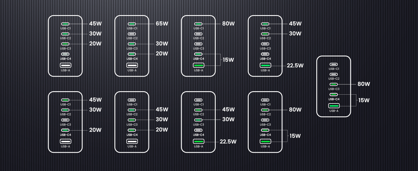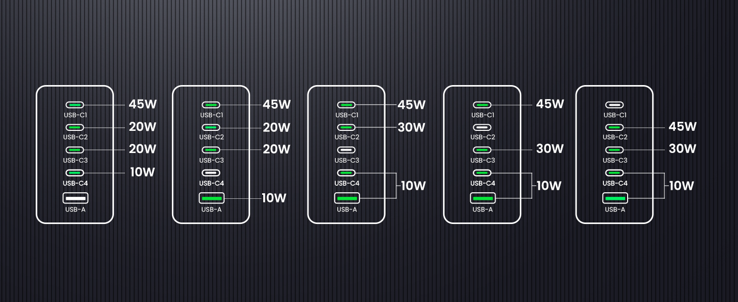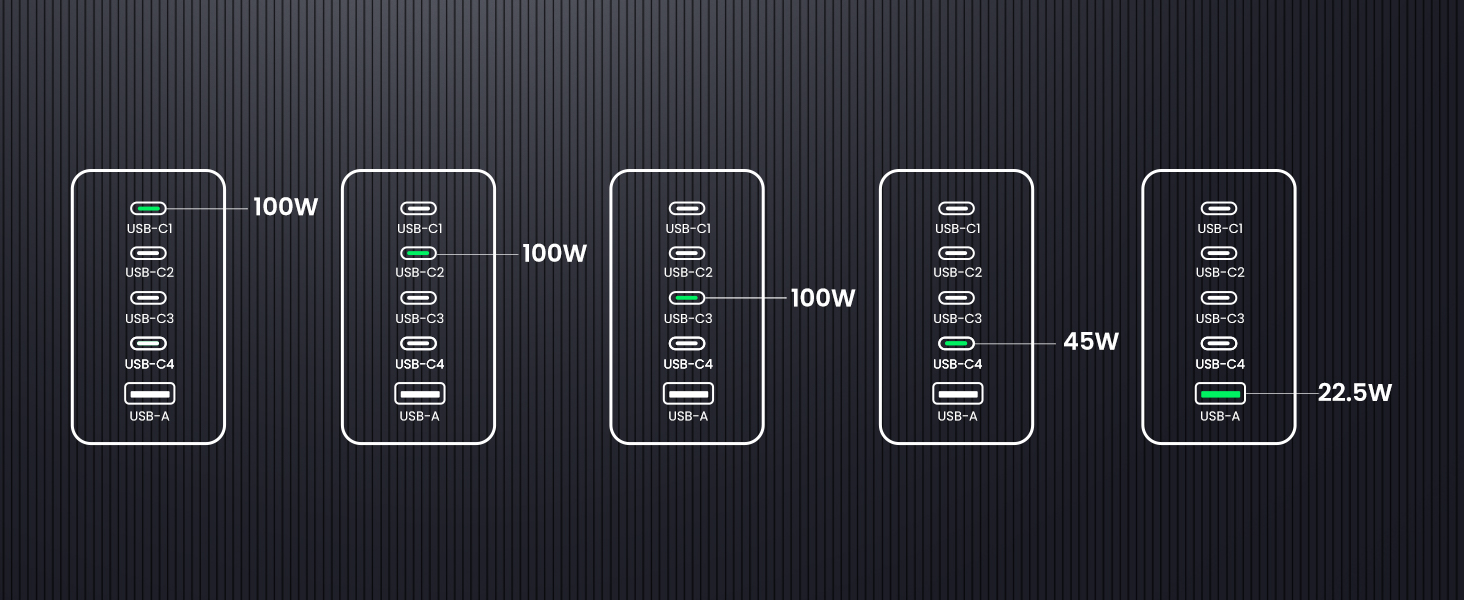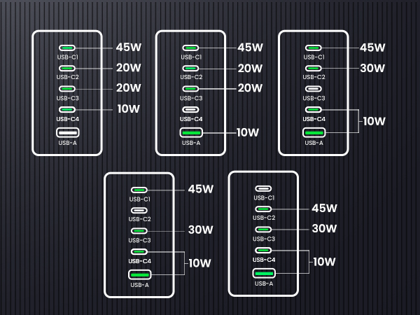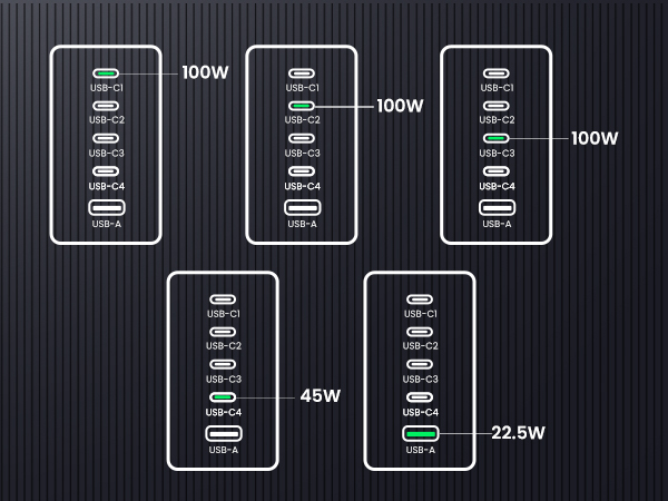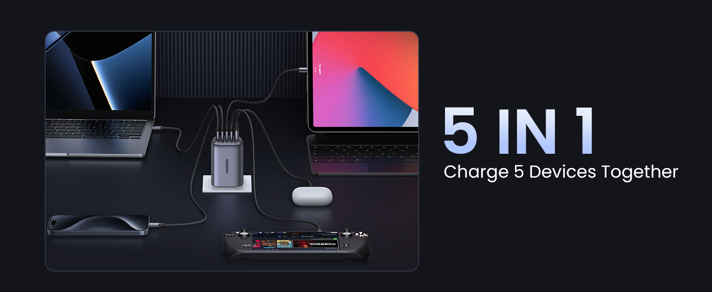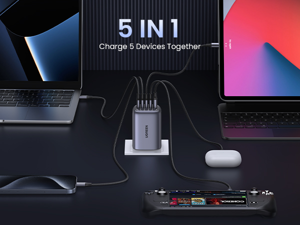 - 【5 Ports, More Choices】With 4 USB-C ports and 1 USB A port, this 100W type c charger allows you to charge 5 devices at fast charging speed, so that you can charge your MacBook, iPad, iPhone, Airpods at one time.