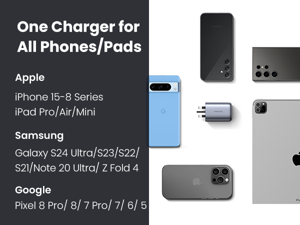 - 【Universal Compatibility】This 100W USB C wall charger compatible with MacBook Pro, MacBook Air, HP Specter, Huawei MateBook, NoteBook, HUAWEI P60, Steam Deck, iPad Pro, iPhone 16/15 /14/13 /12/11, AirPods Pro, MagSafe, Samsung Galaxy S25 Ultra /S25+ /S25/ S24 Ultra/S24/S23/S20/Note 10, Huawei P40 / P30 Pro / Mate 30, Mate20, Xiaomi Mi 10, Note 10 etc.