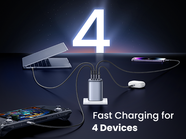 - 【4 Ports, More Choices】With 3 USB-C ports and 1 USB A port, this 100W type c charger allows you to charge 4 devices at fast charging speed, so that you can charge your MacBook, iPad, iPhone, Airpods at one time.