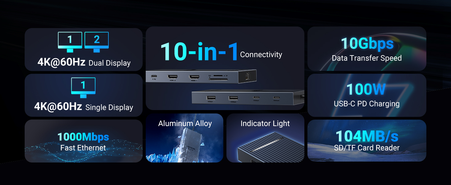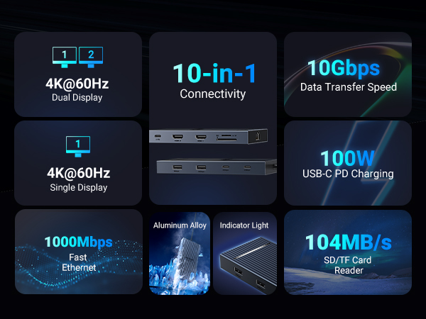 - 【10 In 1 USB C Docking Station】UGREEN docking station comes with 2x4K@60Hz HDMI, 2x10Gbps USB-C, 2x10Gbps USB-A data ports, 1x100W USB-C PD port, 1x1000Mbps Ethernet port and 104MB/s SD/TF Card slots.