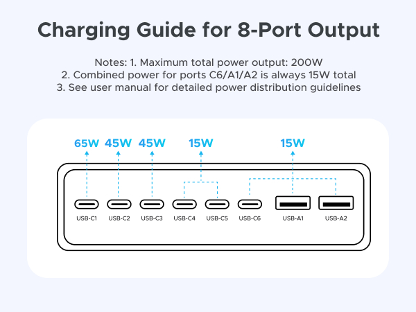 - 【8-Port 200W Hyper-Powered GaN Charging Station】Charge your device with the total 200W power! This premium GaN station 8 devices(laptops, tablets, phones...) simultaneously via 6*USB C and 2*USB A. Perfect for Middle Eastern homes/offices using multiple Apple and Android devices simultaneously.