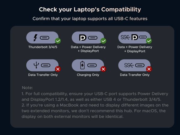• 【100W Power Delivery】 Supports up to 85W USB-C pass-through charging for your laptop, reserving 15W for other port operations. The port only supports charging and does not facilitate data transfer or video output.