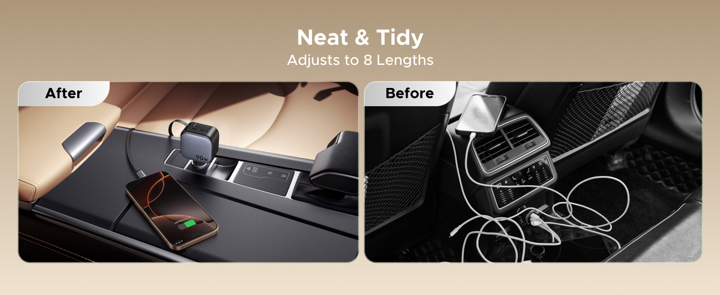 - 【Keep Your Car Clean】Normal car chargers require multiple charging cables when in use, which looks messy. Compared with traditional car chargers, retractable cable car chargers can solve the problem of messy charging cables and make your car look tidier.