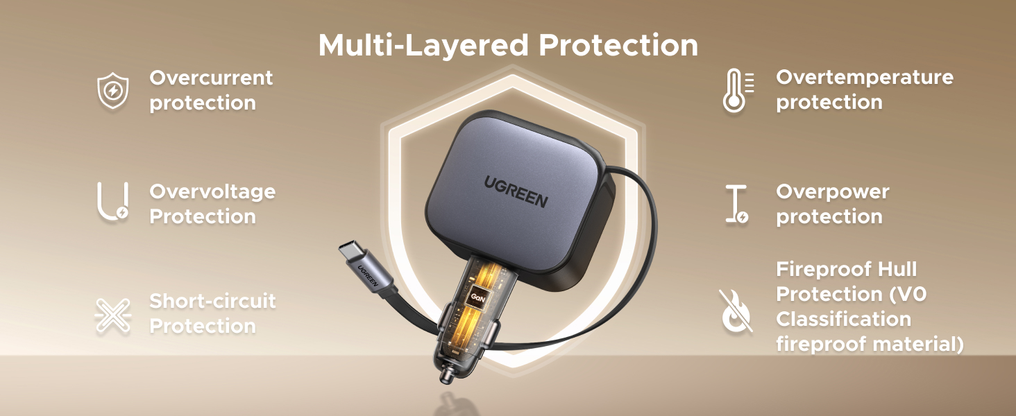 - 【Military-Grade Safety Fortress】Engineered with 5-layer protection, this 145W car fast charger combats over-current/short-circuit risks, input voltage spikes/drops, and overheating with its 90°C auto-throttling system (intelligently reduces C2 to 65W/45W and C cable to 45W/30W). Housed in flame-retardant 94V-0 PC casing, UGREEN Type C car charger maintains a cool ≤65°C surface even during extended 145W operation.