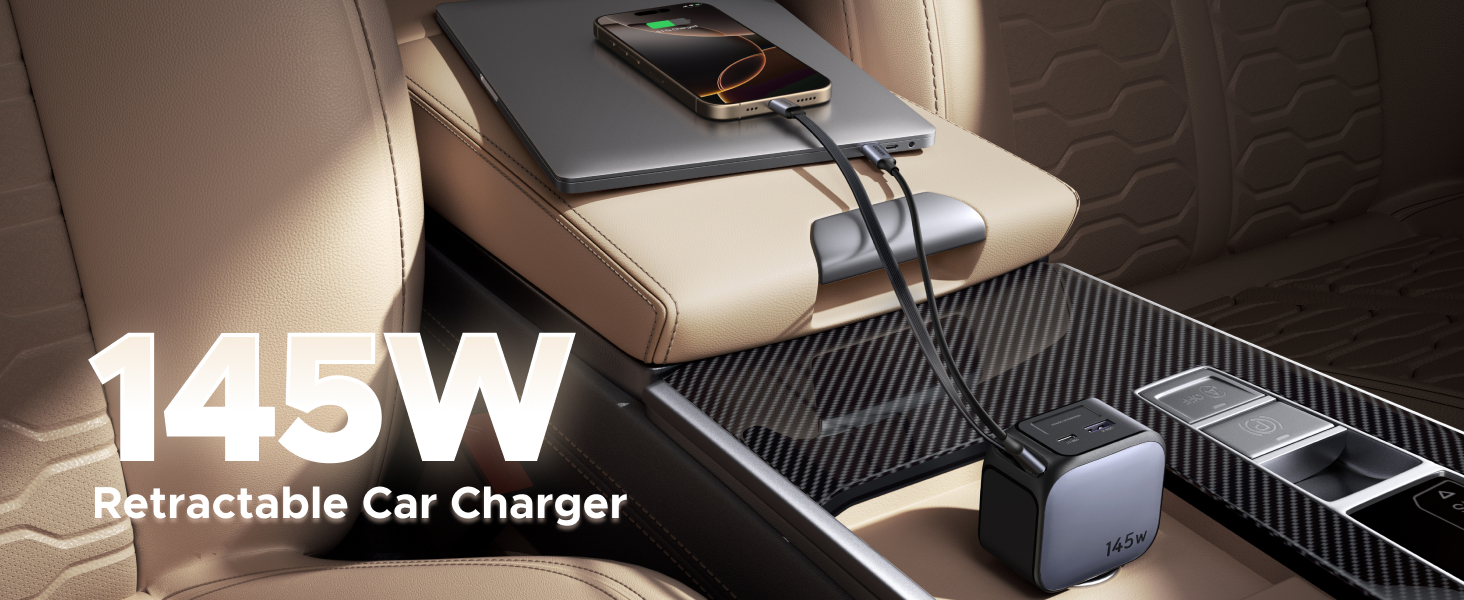 - 【145W Max Power & 100W Laptop Charging】UGREEN 4-in-1 retractable car charger features a fast USB Type-C cable, delivering a colossal 145W total output. The dedicated USB-C2 port unleashes a full 100W, powerful enough to rapidly charge demanding laptops like the MacBook Pro 16' or gaming rigs while driving. Never face a dead device on critical trips. This retractable car charger for laptops is your ultimate high-speed power command center.