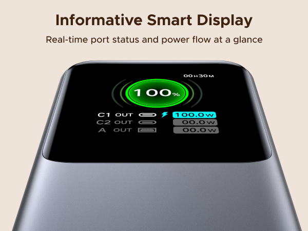 - TFT Display: The UGREEN Nexode mobile power supply features a high-quality, high-resolution display that displays accurate real-time information about battery capacity and power output, complete with user-friendly robot icons.