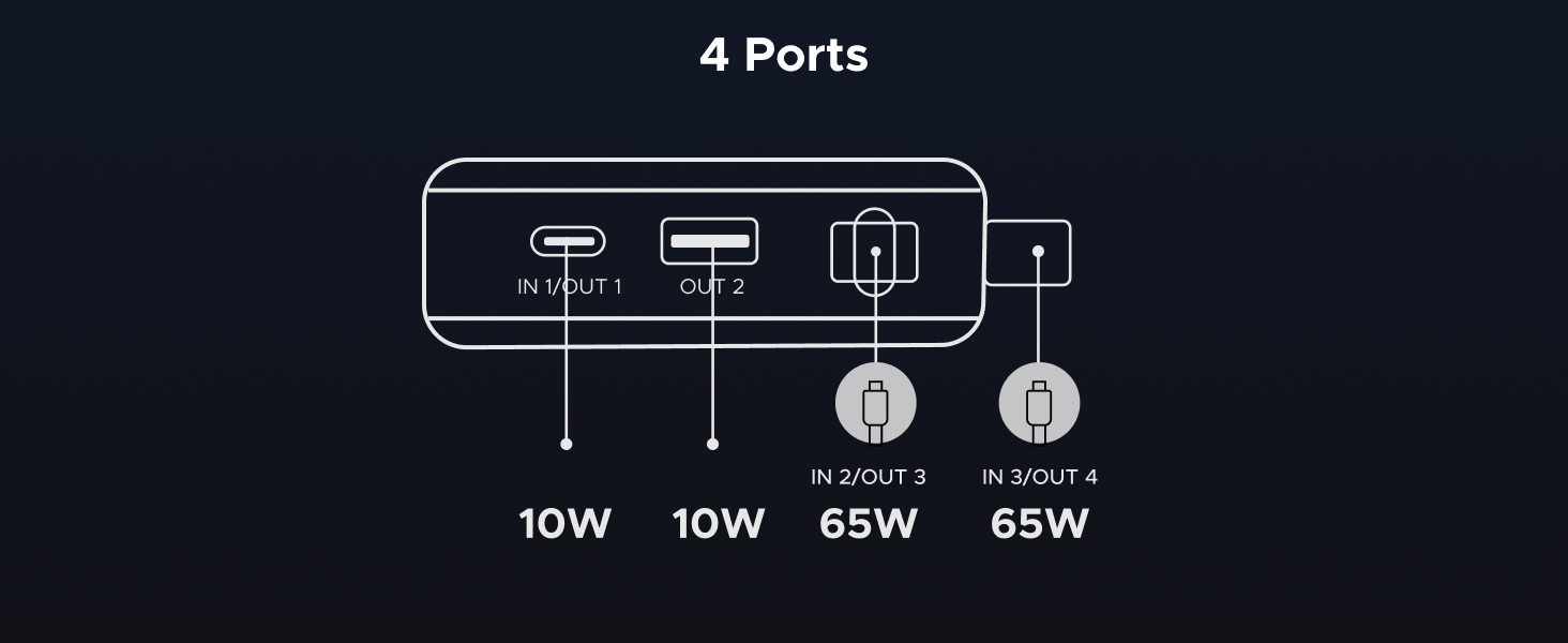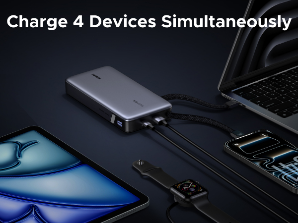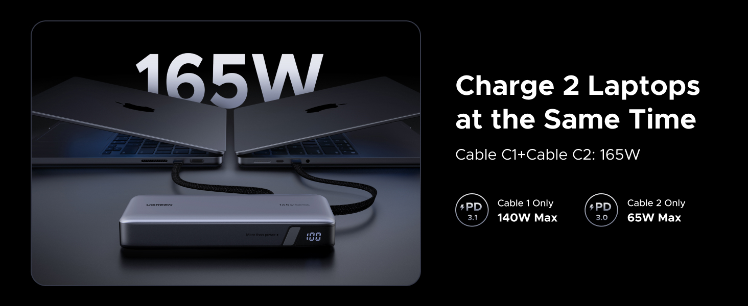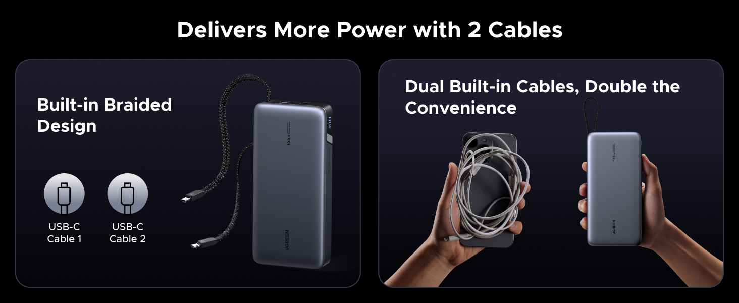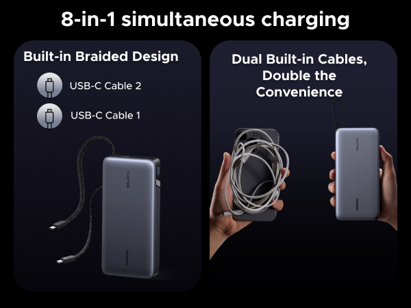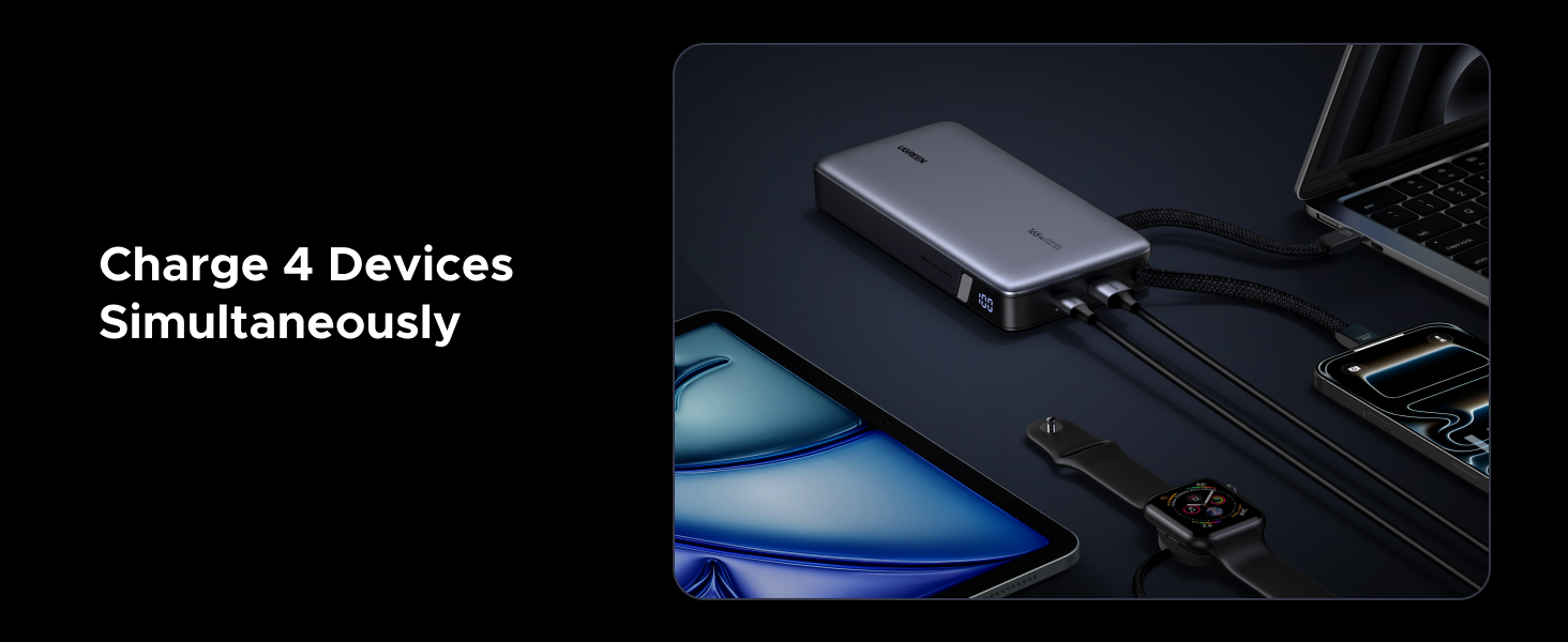 - 165W High-Speed Charging with 4 Ports: This power bank delivers a total output of 165W, featuring two built-in USB-C cables and two additional ports (USB-C + USB-A). Charge up to 4 devices at the same time, making it the perfect all-in-one power station
