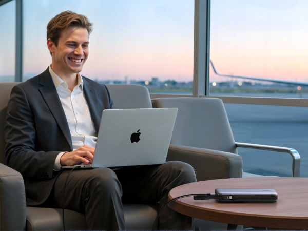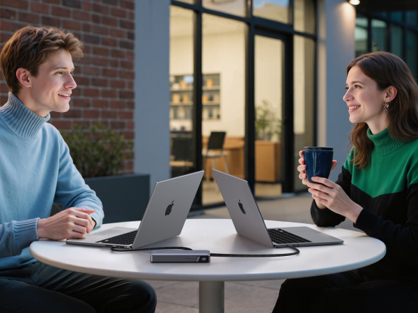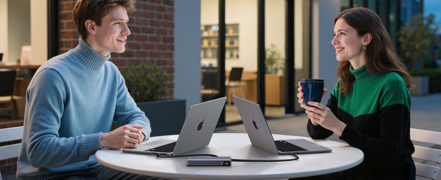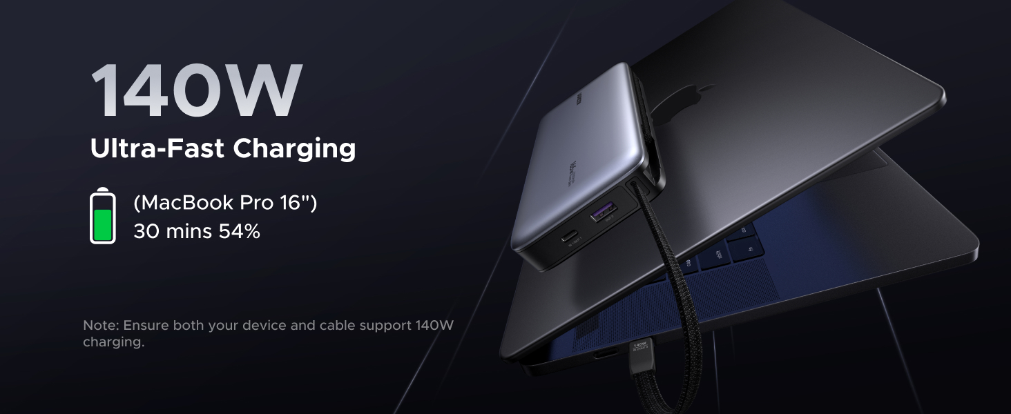 - Built-in 2 USB-C Cables: Equipped with two integrated USB-C cables supporting 140W and 65W PD fast charging, the portable charger allows for charging two laptops simultaneously when traveling or in a meeting. The 140W cable can charge a 16-inch MacBook Pro to 54% in just 30 minutes, offering unparalleled convenience and speed