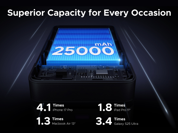 - 25000mAh Long-Lasting Power: With a 90Wh battery capacity, this battery pack can charge the iPhone 17 Pro up to 4.1 times, a Galaxy S25 Ultra 3.4 times, or a 13-inch MacBook Air 1.3 times. Ideal for multi-day trips or extended work sessions