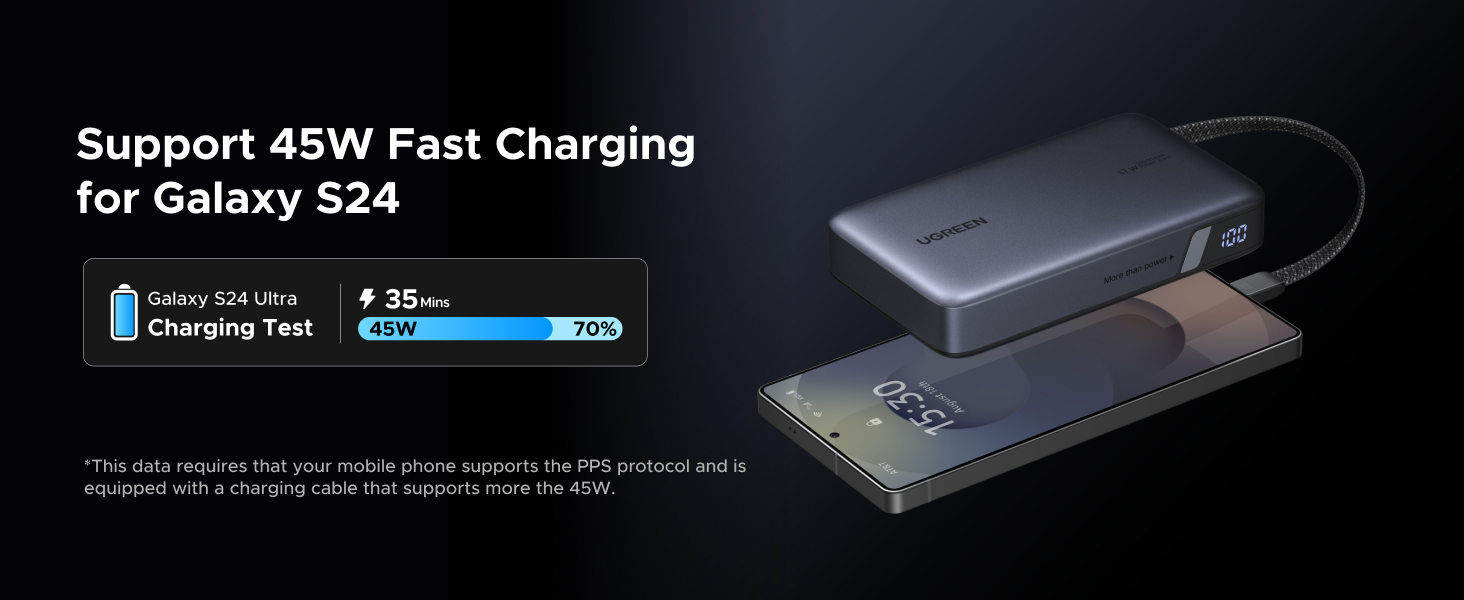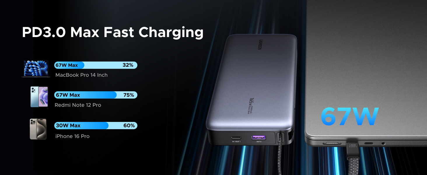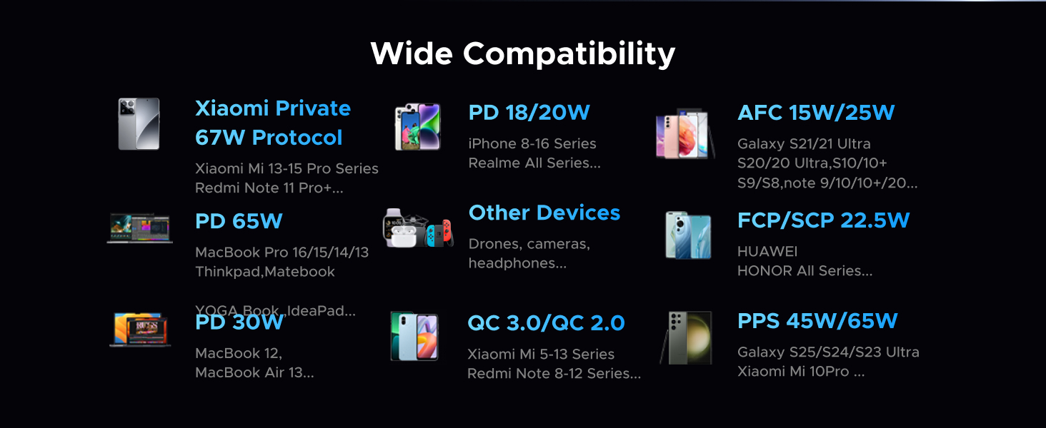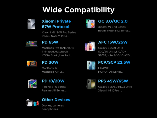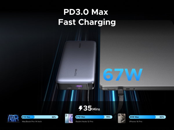 - 67W PD Fast Charging for Laptop & Phone: Experience fast charging with 67W(67W only for Xiaomi ,65W for Other devices) PD bidirectional power delivery. Charges the Samsung S25 Ultra to 70% in just 35 minutes and boosts iPhone 17 charging speed by 2x+. Intelligent current detection ensures safe, optimized charging for all devices.
