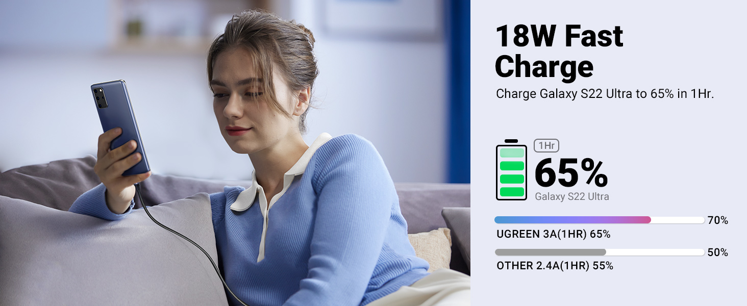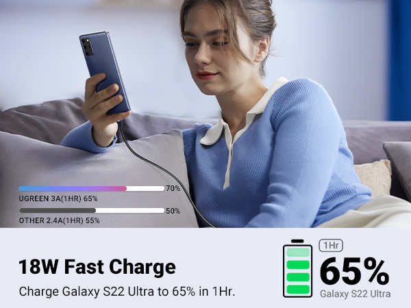 - 【3A Fast Charge and Data Transfer】: UGREEN c type charging cable provides Max 5V 3A, 9V 2A or 12V 1.5A for your type-c smartphones. USB type c charging cable compatible with QC 3.0, Quick Charge 2.0, Samsung AFC and Huawei FCP. The USB C cable takes shorter than 2h to finish charging a Samsung S9, as fast as the original cable.For data syncing, this USB c to USB a 2.0 cable supports Max 480Mbps.