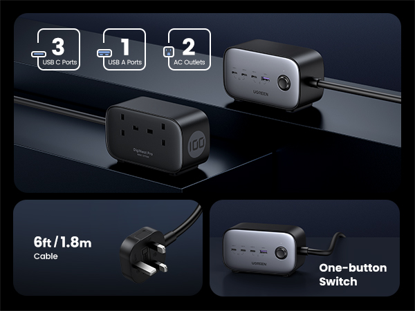 - 【More Ports, More Possibility】: UGREEN 6-in-1 extension cord power adapter is equipped with 3 USB C ports(PD 100W max), 1 USB A ports(QC 18W max) and 2 AC outlets(2990W 13A max). Charging 6 devices simultaneously, like phones, tablets, laptops, and domestic appliances, easily realizing multi-device charging needs.