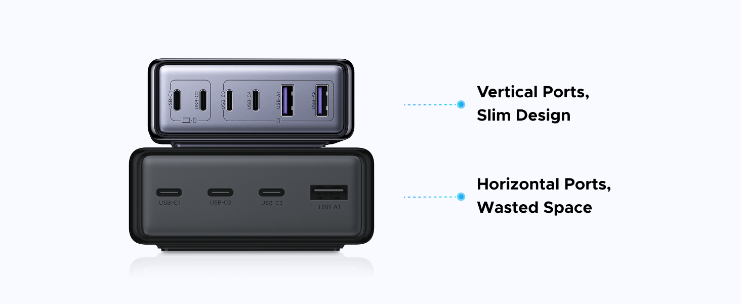 - 100W 6-in-1 GaN Charging Station: Power every device on your desk from this UGREEN 100W usb c charger; 4 USB-C and 2 USB-A ports share a blistering 100W total output: enough to fast charge a MacBook Air, iPhone and iPad simultaneously; Save not only time but also the annoying cable clutter with UGREEN's versatile 100W charging station