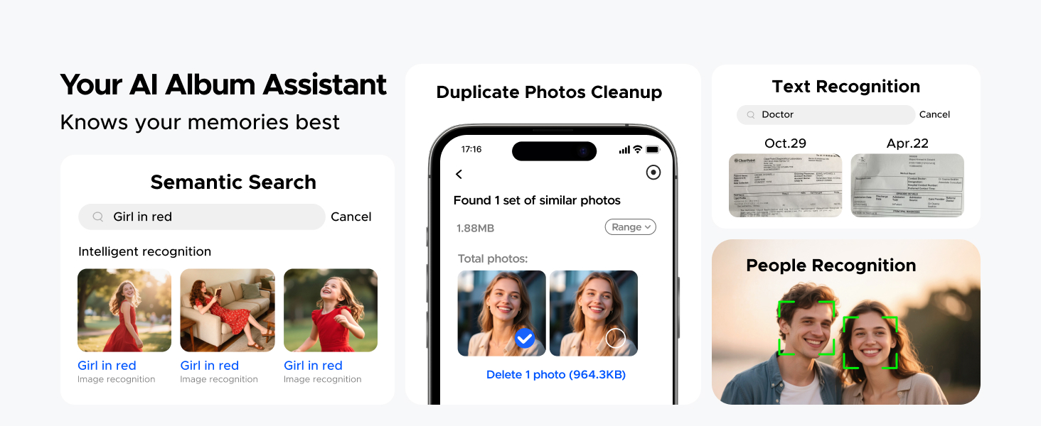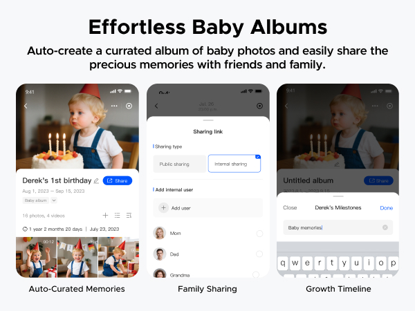 - AI automatically organizes photos by faces, scenes, and locations, removes duplicates, and creates personalized baby growth albums—so all precious moments are effortlessly preserved and easily shareable with family via QR code or link.