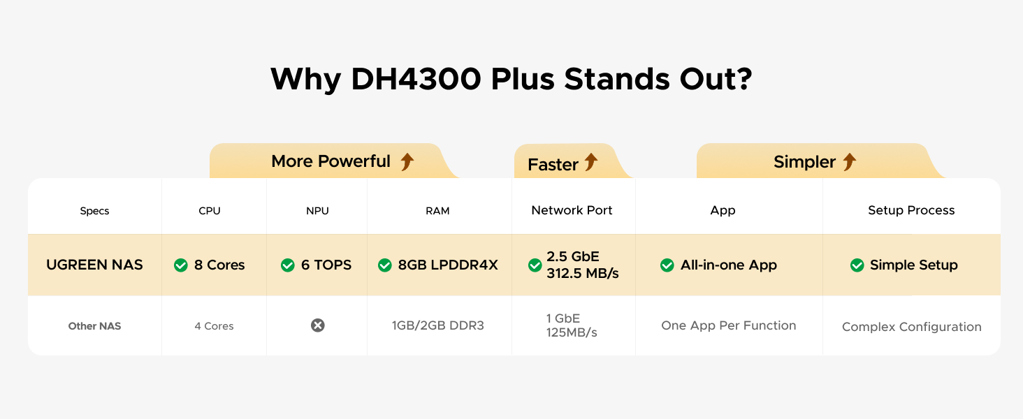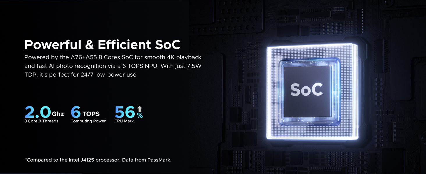 - Powerful, Efficient Hardware: Driven by the A76+A55 8 Cores and 2.5GbE, everything runs efficiently and smoothly—even with multiple applications. 1 GB is transferred in just 3 seconds—ideal for video editing, 4K streaming, and everyday data storage.