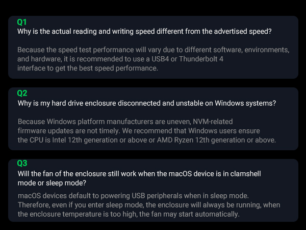 - Self-Monitoring, Ensuring Secure and Reliable Backup: The S.M.A.R.T. technology enables timely detection of the hard drive's operational status, while the TRIM command function optimizes the performance of the solid-state drive. The USB4 NVME Enclosure facilitates self-monitoring, ensuring the security and stability of your data transfers. Additionally, the equipped silicone case effectively mitigates the impact on the hard drive enclosure