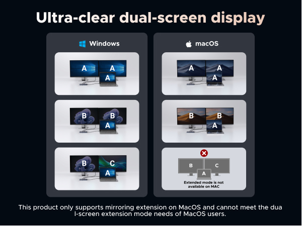- Wide Adaptability: The Type-C docking station is compatible with ThinkPad X1, ZenBook, Chromebook, Surface, etc. Note:Windows systems can utilize an extended dual-screen display, Mac devices are limited to mirror mode