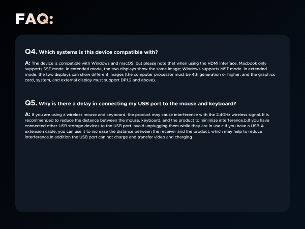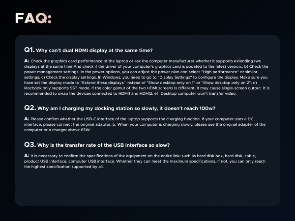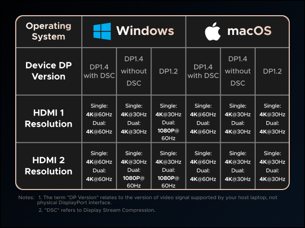 - Dual 4K Docking Station:The Dual 4K HDMI Monitor Docking Station features two 4K@60Hz HDMI ports, allowing for a dual-screen 4K@60Hz HD configuration.Due to MacOS limitations, all extended monitors will display the same content when connecting a MacBook.