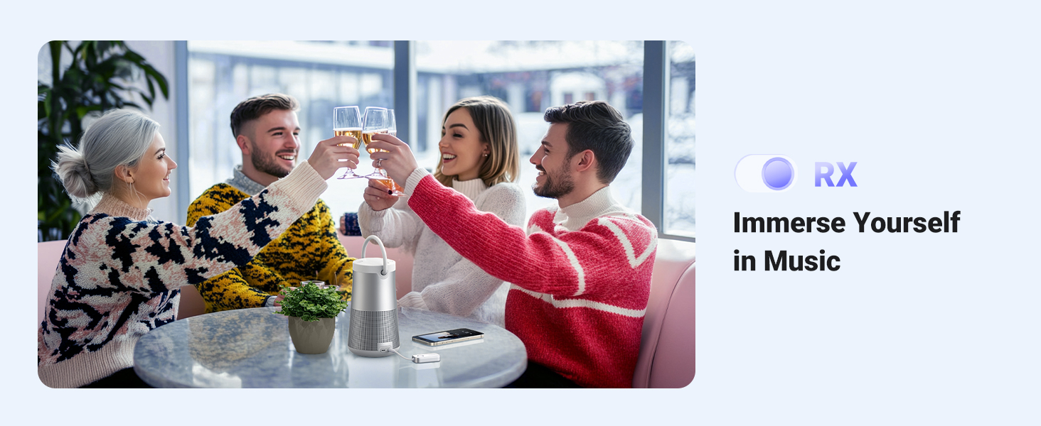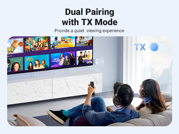 - Dual Pairing: The Bluetooth adapter can connect two devices simultaneously in TX and RX mode. This means you can watch TV with friends or play on the PC without disturbing other family members