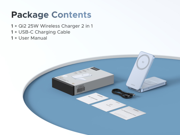 • What's Included: Qi2.2 25W magnetic wireless charger, 1M USB-C cable (wall charger excluded), operation manual, and our friendly customer service