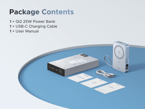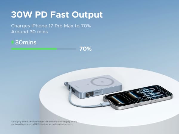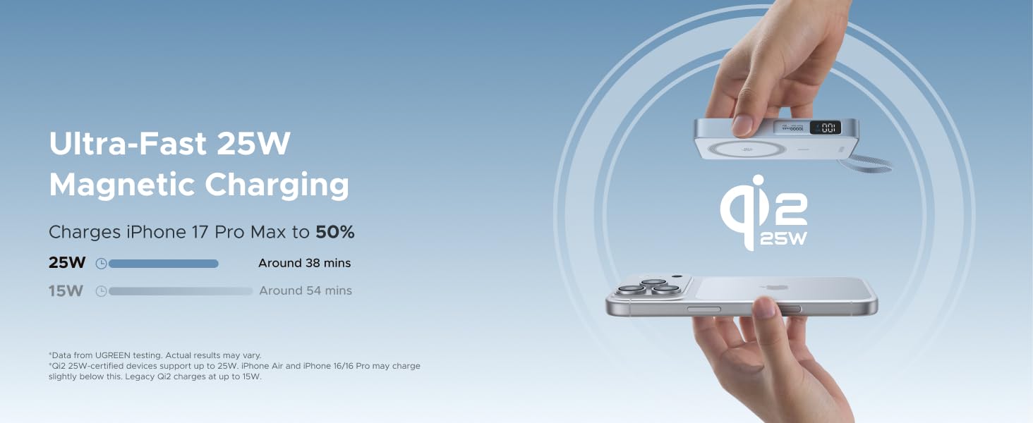 • Supports Qi2 25W Magnetic Wireless Fast Charging:Supports Qi2 standard, enabling up to 25W magnetic wireless power delivery! Charging an iPhone 16 Pro Max from 0% to 33% takes just 20 minutes. With magnetic automatic adhesion and automatic positioning, it provides a stable high-output Qi2 25W power bank for iphone
