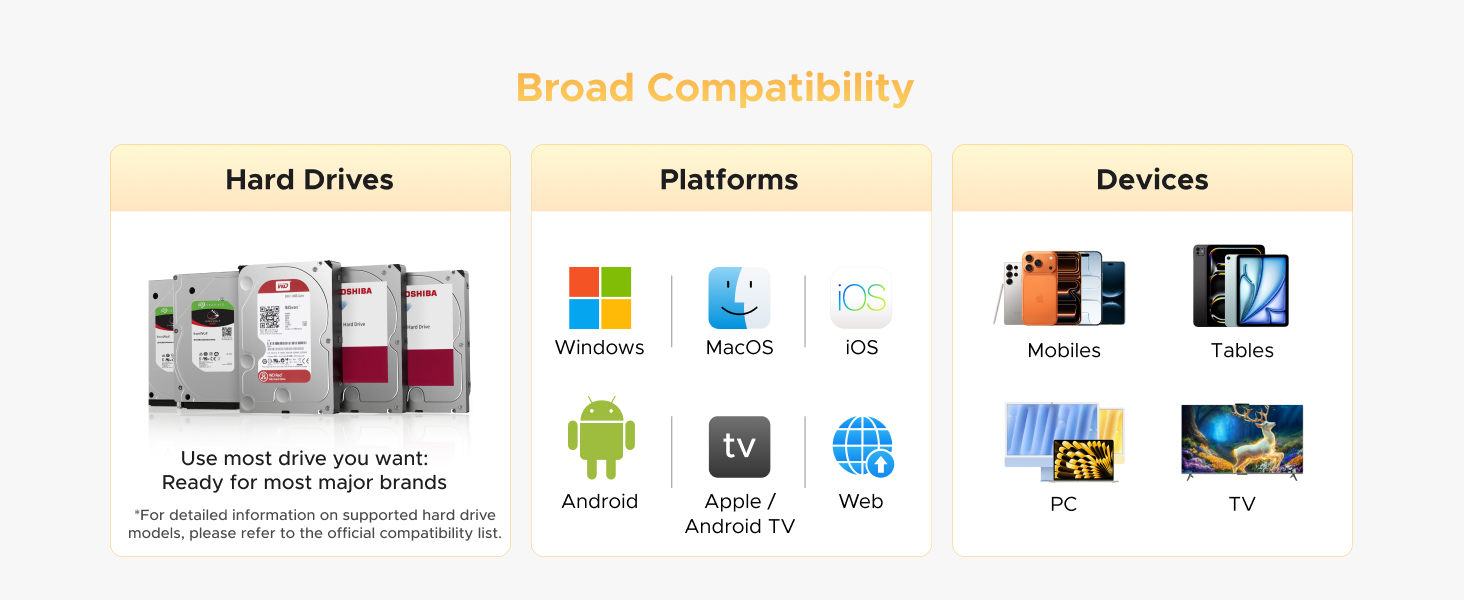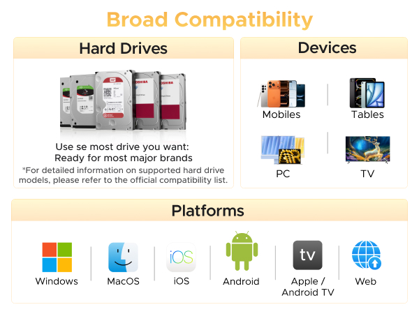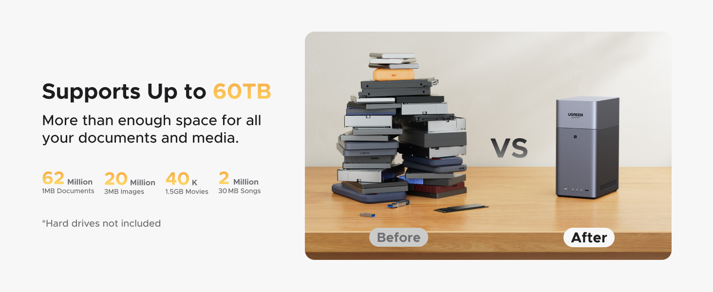 • "User-Friendly App & Easy to Use: Connect quickly via NFC, set up simply and share files fast on Windows, macOS, Android, iOS, web browsers, and smart TVs. You can access data remotely from any of your mixed devices. What's more, UGREEN NAS enclosure comes with beginner-friendly user manual and video instructions to ensure you can easily take full advantage of its features. *Storage disks not included."