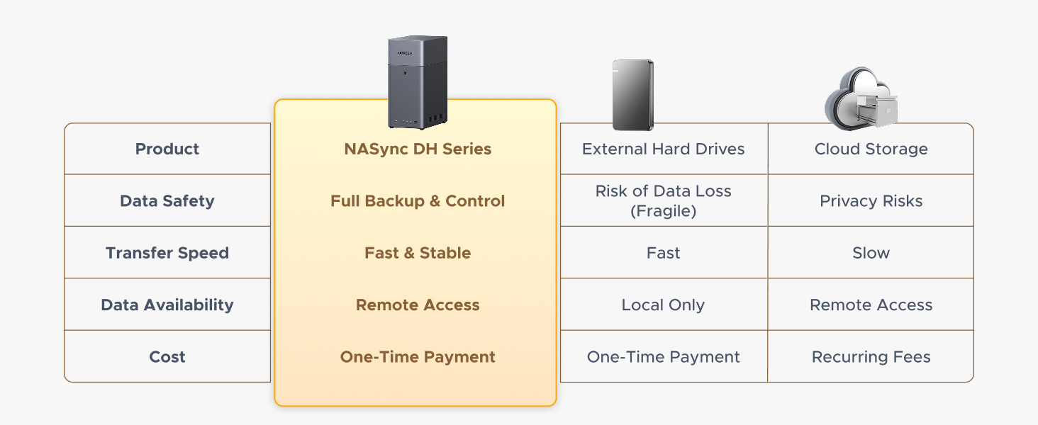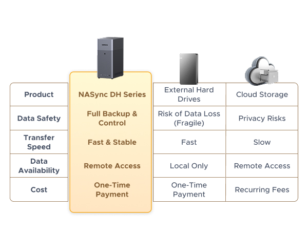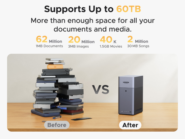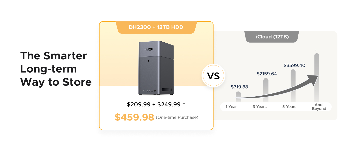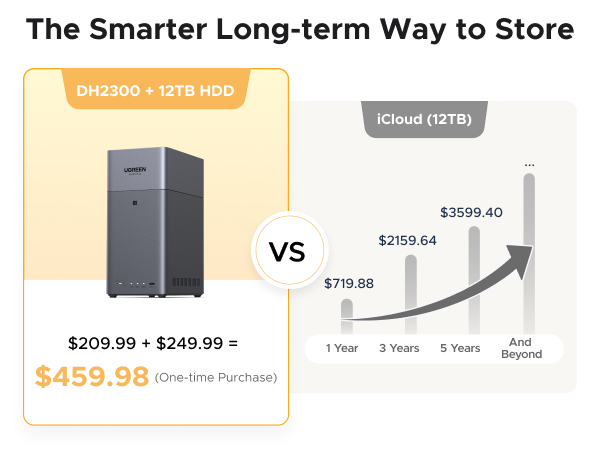 • More Cost-effective Storage Solution: Unlike cloud storage with recurring monthly fees, A UGREEN NAS enclosure requires only a one-time purchase for long-term use. For example, you only need to pay $629.99 for a NAS, while for cloud storage, you need to pay $719.88 per year, $1,439.76 for 2 years, $2,159.64 for 3 years, $7,198.80 for 10 years. You will save $6,568.81 over 10 years with UGREEN NAS! *NAS cost based on DH4300 Plus + 12TB HDD; cloud cost based on 12TB plan (e.g. $59.99/month).