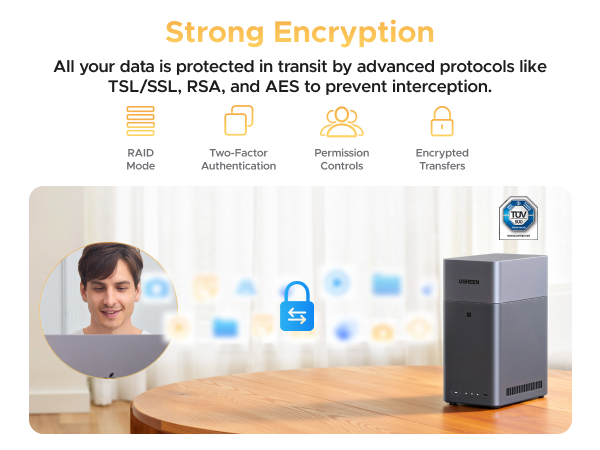 • Your Data, You Control:No third-party clouds, no hidden access, UGREEN NAS provides a more secure and private data storage solution. It stores data locally on your private hard drives and does automatic backups. Thus, you can keep full control over it. The advanced encryption is TRUSTe certified in the United States and is awarded the first (and only) ETSI EN 303 645 certification mark for NAS products by TÜV SÜD Group.