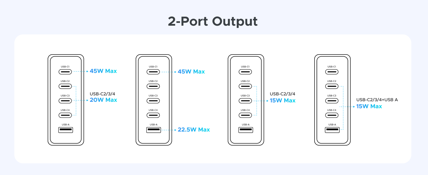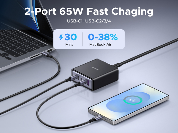 - 【Single Port Up to 45W Fast Charging】Unlock Lightning Speed: Three USB-C ports (C1/C2/C3) can provide up to 45W power, the USB C charger can charge a MacBook Pro to 38% in 30 minutes via USB C1/C2/C3. Perfect for high power professionals in Dubai/Riyadh etc.